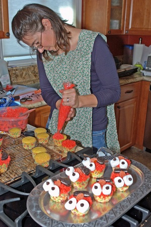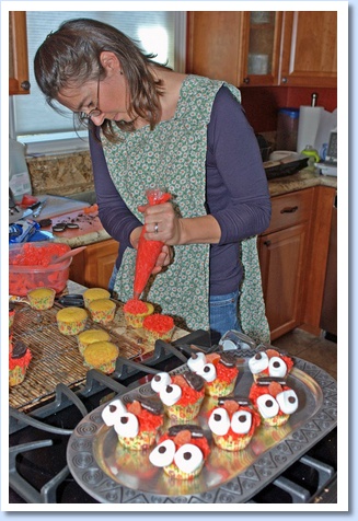 Making Elmo cupcakes for Anthony's